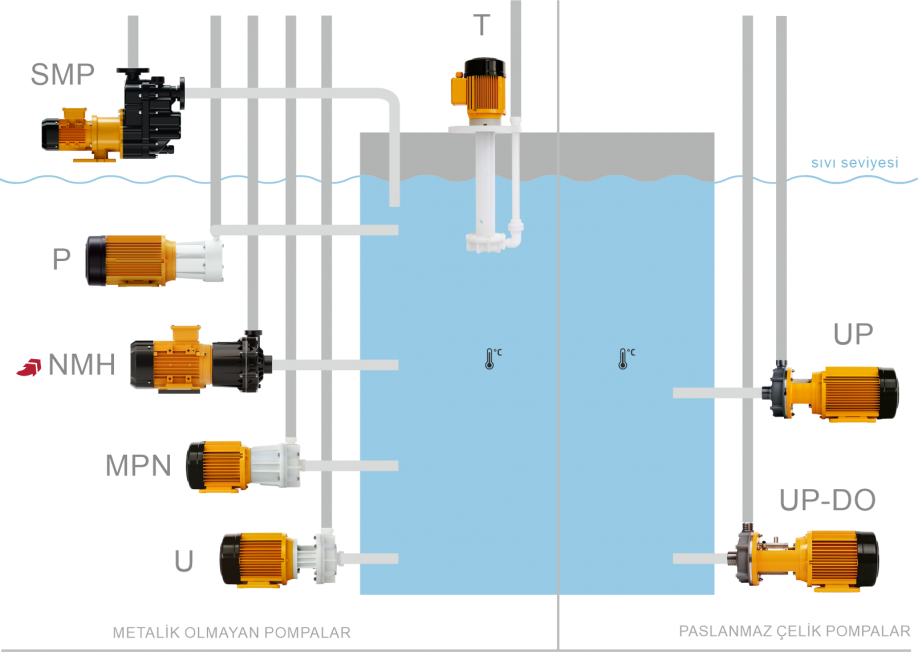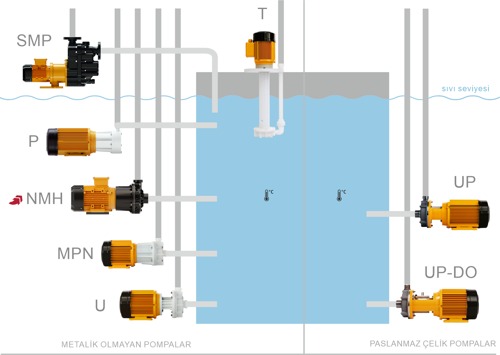 Tek mekanik salmastralı bu sağlam ve ucuz pompalar, açık bir mil tarafından tahrik edilir. Aşındırıcı ve agresif ortamlar ve pompalanan ortamdaki ferromanyetik parçacıklar için uygundurlar.
